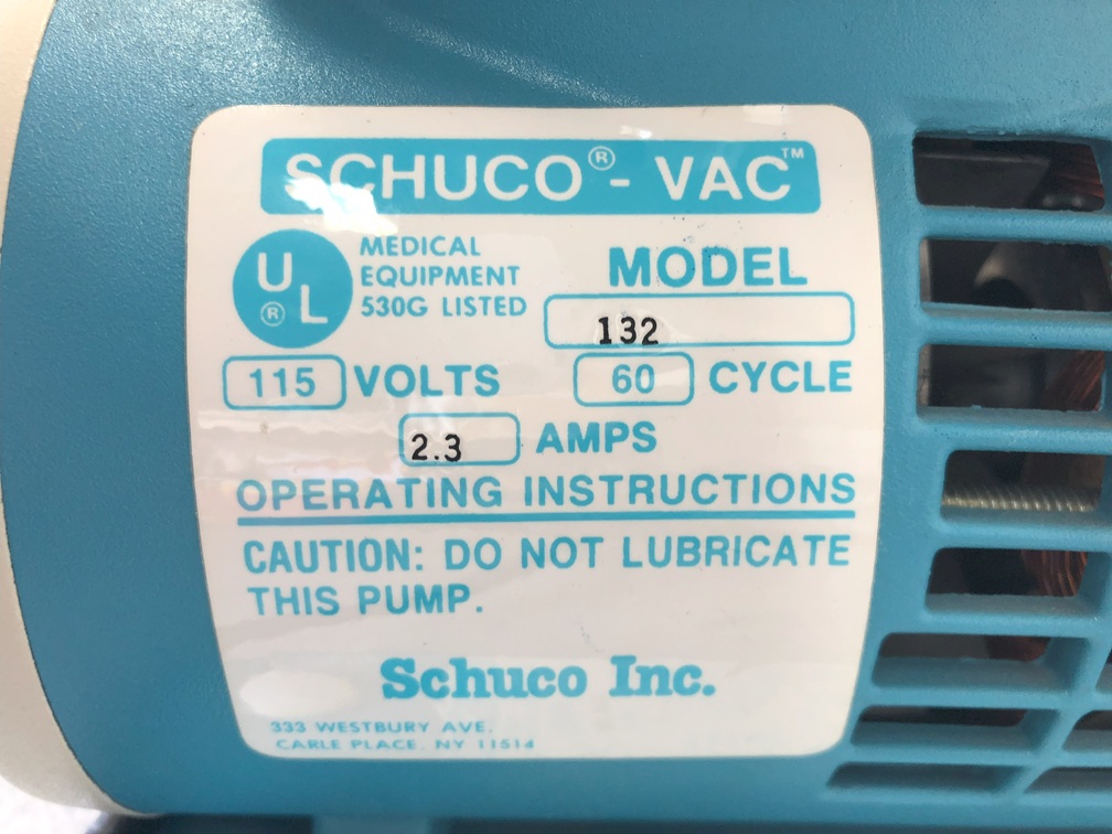 The Schuco Model 132 high volume aspirator and suction system is simple, portable and reliable. Designed to suit the needs of the uncompromising professional in the hospital, institution or physician's office, this durable unit has an ultra-strong lightweight casing and controlled vacuum regulation from 0-22'' Hg. Voltage is 115/60.