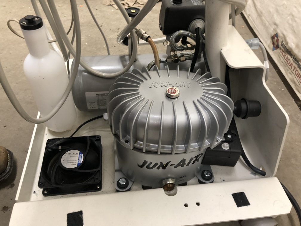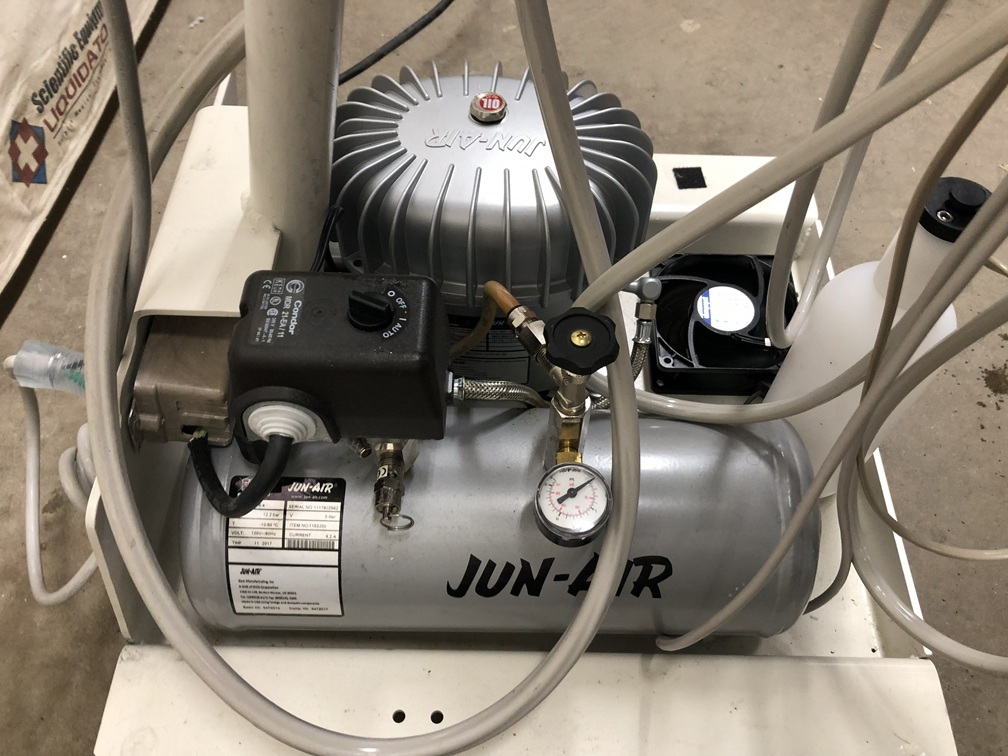 The PAC I Self-Contained Unit includes its own air suppy system. Integrated with the fixed-height mobile frame is a 1/2-hp, 120 or 240 VAC air compressor with a four-liter reservoir. A quiet cooling fan keeps the compressor running efficiently. The specially designed air saliva ejector is compact, requires less air, and is easily removed for cleaning.