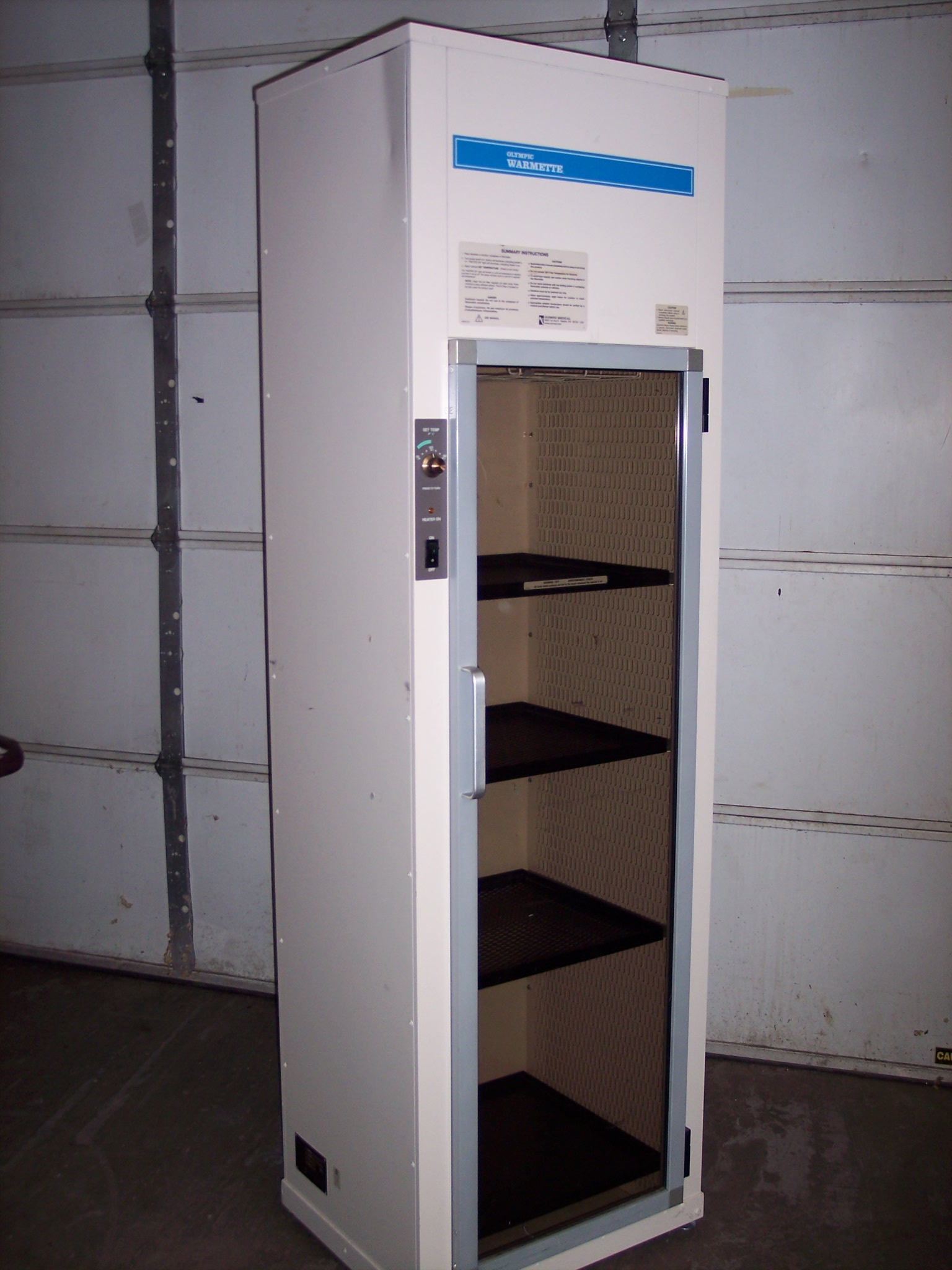 Unit has a dent on the top left side, does not affect functionality With the Olympic 56948 Model 48 Warmette, you can have warm blankets and solutions closer to where you use them. Instead of carrying blankets from an inconvenient, centrally-located warmer, you can have a Warmette near your work station, loaded with blankets, ready for use. This will save you steps and time. Also, a Warmette nearby means your blankets will still be warm when you get them to your babies. The Model 48 Warmette features a full-length, transparent, heat-saving door so you can check your supplies at a glance. All supplies can be accessed by opening one door. 3 Shelves 1 Bottom Tray Inside Dimensions: 20.5" x 65" Outside Dimensions: 25.5" x 21" x 84" H