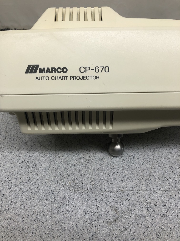 The Marco CP-670 Automatic Chart Projector is a wireless remote controlled unit which provides instantaneous selections of 33 of the most popular ophthalmic charts used. With programmable random access capability, the instrument enables you to quickly and easily program pre-selected slides and present them in a sequence most suited to your particular refraction needs. Superior masking features and red/green filtering over any appropriate chart also extends the capability of the CP-670. The excellent design in both function and style will increase the efficiency of your examination procedures, provide you with state-of-the-art technology, and enhance the decor of your office.