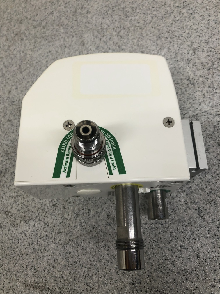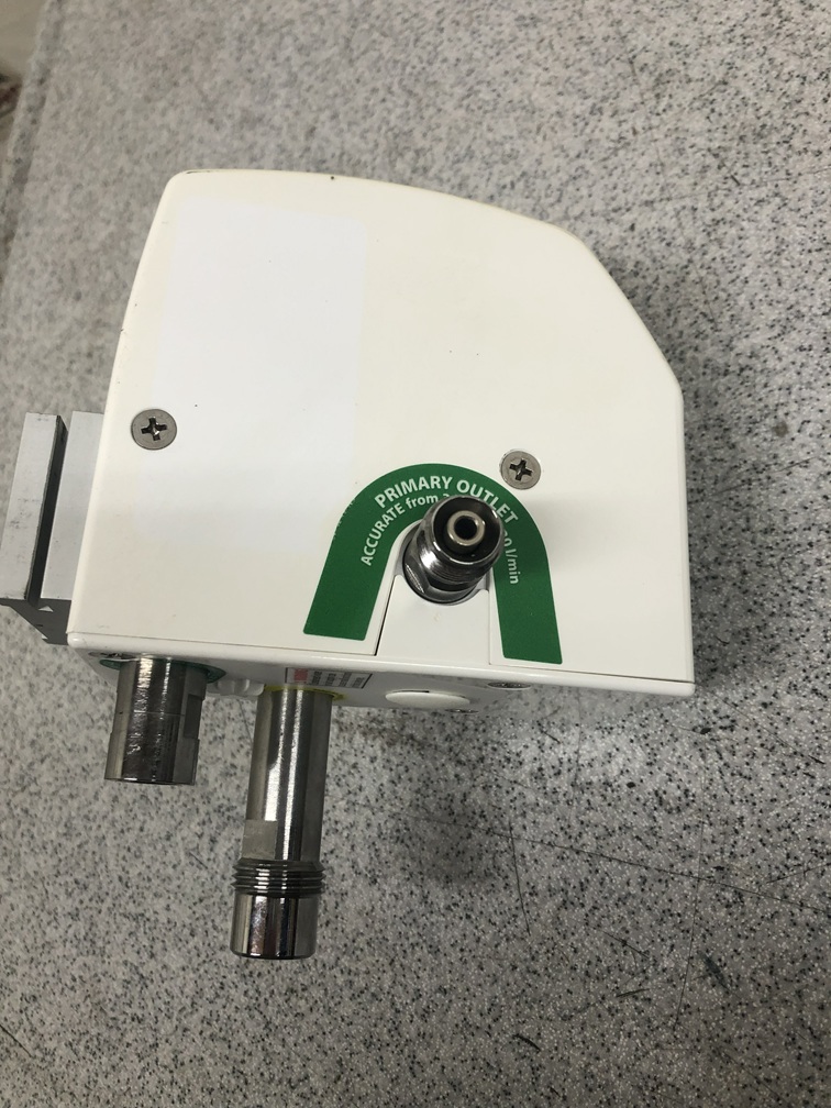 Dimensions: (without fittings) Depth: 4.92" (12.5 cm) Width: 2.25" (5.7 cm) Height: 4.10" (10.4 cm) Weight: 2.9 lbs (1.3 kg) Operating Temperature: 59F to 104F (15C to 40C) FiO2 Accuracy: +-3% of full scale Bypass Alarm Activation: 18-22 psi (1.2-1.5 bar) Primary Outlet Flow Range: 3-30 lpm Auxiliary Outlet Flow Range: 0-30 lpm Bleed Flow (at 50psi, 3.4 bar) 13 lpm or less Maximum Combined Flow (all outlets): = 30 lpm No. of Primary Outlet Ports: 1 No. of Auxiliary Outlet Ports: 1