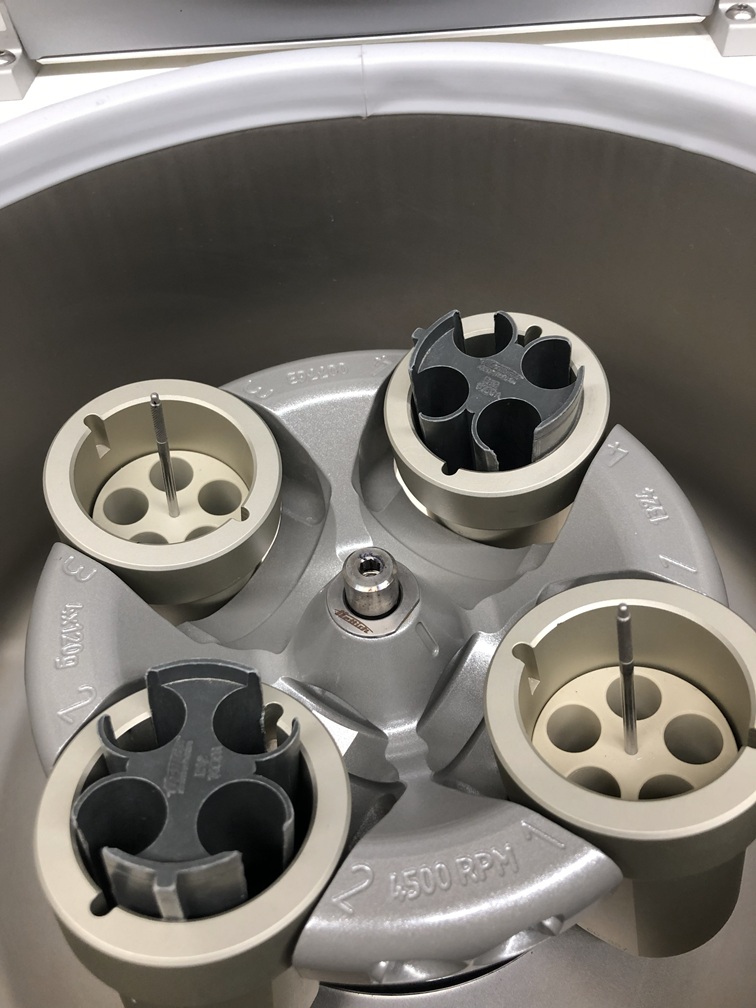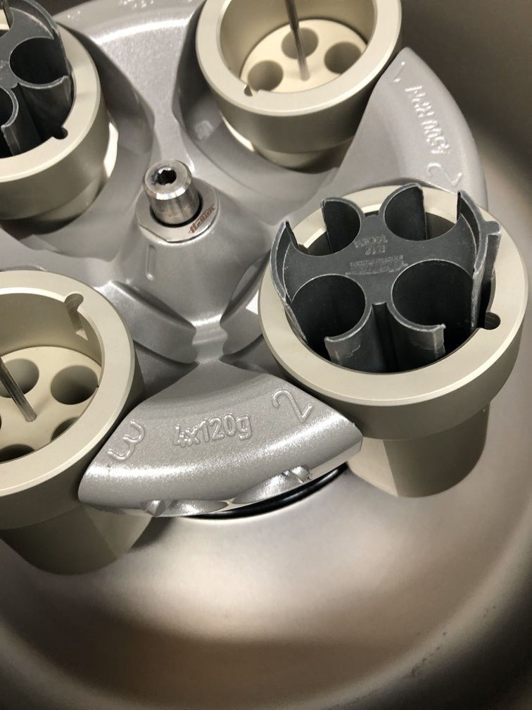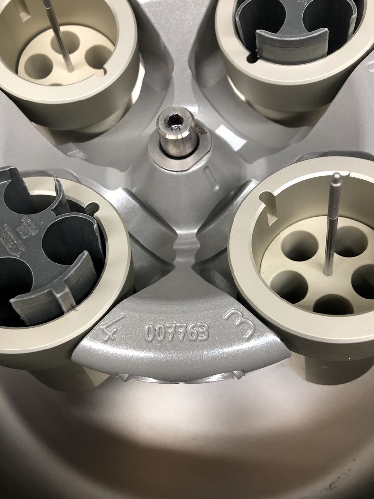 The Hettich Universal 320 Centrifuge reaches maximum speeds up to 15,000 RPM with a maximum RCF up to 21,382 x g. Timer up to 99 minutes, featuring 10 programmable run memories. Safety features include powered lid locking, lid dropping protection, lid lock and hold, emergency lid lock release, motor overheating protection, chamber overheating protection, and imbalance switch-off. This rotor reaches maximum 5000 RPM.